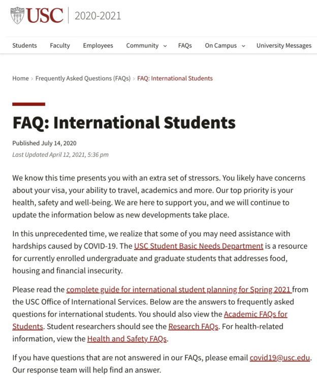 以下图中截取的南加州大学官网页面为例,面向国际学生展示了有关于学术、学费、助学金、餐食、住宿、活动、健康安全等等五花八门的信息,涵盖了学生们未来校园生活的方方面面,非常全面和实用。