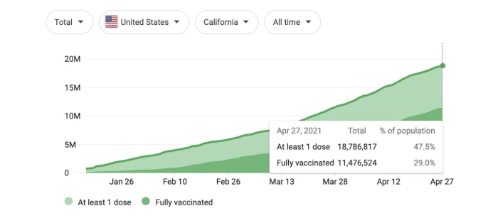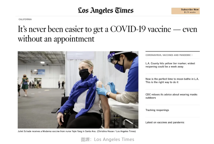 就加州而言,由于疫苗供应量的提升,洛杉矶许多疫苗接种点本周起甚至都已放开了预约限制,民众们无需预约即可直接前往相应地点接种,又进一步加快了疫苗普及的效率。而加州其他地区的疫苗预约名额也都非常充足,这也距离加州6月15日全面重启的目标更近了一步