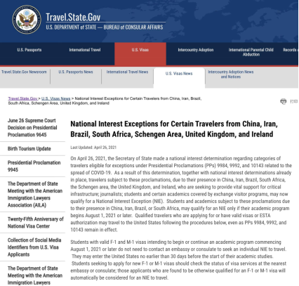 这意味着在今年秋季学期,拥有有效F-1签证和M-1签证的学生将自动获得NIE豁免,无需与大使馆或领事馆核实,可以直飞美国开始/继续学业,也不必再在第三国中转14天了!
