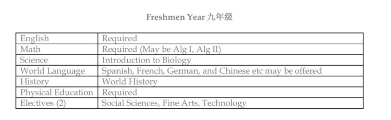 下图就是比较常见的9年级新生课程表,必修课程是:英语、数学(有可能是代数1或2)、科学(生物)、第二语言(西班牙语、法语、德语、中文)、历史(世界历史)、体育、选修课程(2门为社科、艺术、科技类)